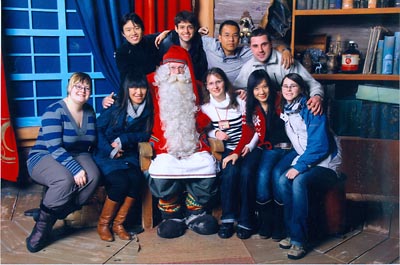 Za celých 14 hodin cesty, kterou můžete vidět na mapce, jsme měli celkem tři zastávky. První o půlnoci na benzínové pumpě ve Vaase (ukrývá se pod písmenkem B), druhou někdy mezi čtvrtou a pátou hodinou ranní na podobném zařízení v Oulu (C) a poslední, tu nejzajímavější v Rovaniemi (D), ve vesnici toho pravého Santy Clause! Jako správnému Čechovi mi samozřejmě dárky nosí Ježíšek, ale nechat si ujít setkání s takovou světovou ikonou, ve Finsku nazývanou Joulopukki, by byla obrovská chyba. A tak jsem i já v devět hodin ráno finského času vyskočila s nadšením z autobusu do pořádné sněhové vánice a vydala se hledat Santovu chalupu. Jenže… je teprve chvíli po Vánocích a celá vesnice si dopřává zasloužený oddech po náročném období, takže všichni sobi a další vánoční pomocníci, včetně jejich pána, nabírají nové síly a vyspávají až do desíti. Měli jsme tak celou hodinu na to, abychom prozkoumali okolí (a vyřádili se na polárním kruhu, který nám ale zůstal skrytý pod pořádnou vrstvou sněhu). Vy si vesnici můžete prohlédnout alespoň tady. Jedna věc ale stojí za slovní popis – Santa parkuje před svým domem tmavě zelenou Škodu Felicii Combi s finskou poznávací značkou!